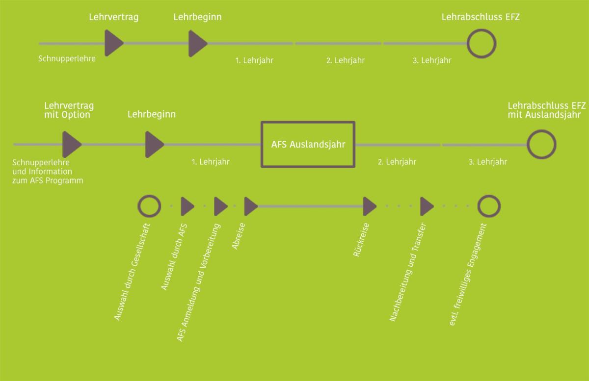 Das Auslandsjahr wird von AFS Interkulturelle Programme Schweiz organisiert. AFS stellt die Betreuung der Lernenden vor, während und nach dem Auslandsjahr sicher – durch AFS-Mitarbeitende und Freiwillige in der Schweiz und in allen Partnerländern. AFS ist die grösste und älteste Jugendaustauschorganisation und hat unter anderem zum Ziel Jugendlichen Wege aufzuzeigen ein «Global Citizen» zu werden. Das Auslandsjahr ist dazu ein Anfang, und danach bietet AFS allen Ehemaligen vielfältige Möglichkeiten sich im Schweizer Netzwerk von über 1‘000 Freiwilligen zu engagieren.